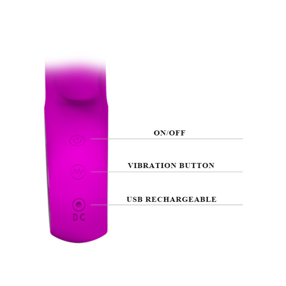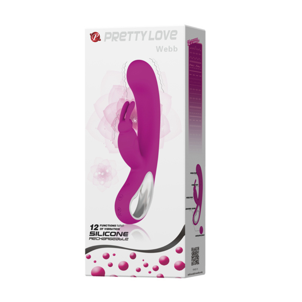 PRETTY LOVE WEBB is a dual vibrator 21 cm (8 Inch) G-Spot and Clitoral Massager, made out of high quality hypoallergenic silicone and offers amazing dual vibration with whisper quiet powerful motors. The slightly curved shape with enlarged head makes Webb a perfect G-spot vibrator. The same time the rabbit ears will stimulate the clitoris. Thanks to the loop handle very easy to hold. 12 different vibration functions allow you to choose the right one and enjoy the waves that suit you.