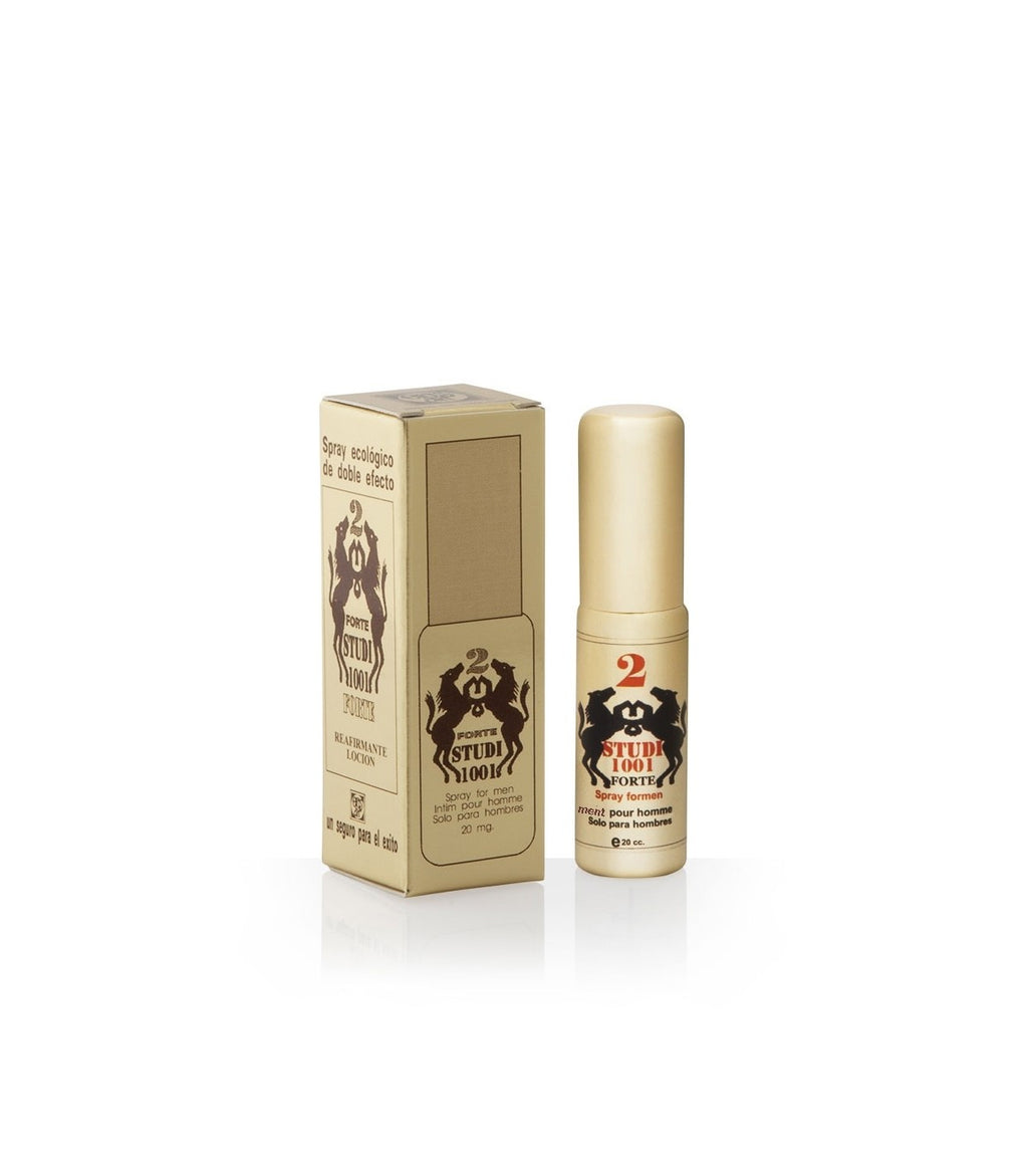 STUDI 1001 FO RTE , A spray for men that delays premature ejaculation, increases erection, achieves greater dimension and makes sexual intercourse more lasting, the principle is the sensitive relaxation effect and good vasodilation to achieve greater filling, and Thus, achieving more turgidity and remarkable appearance with very gratifying results. PRESENTATION : 20cc pocket spray. (Strong formula) APPLICATION : Local. before sexual activity, apply a small amount of solution on the member, doing a light longitudinal massage. It can be repeated as many times as you want. Ingredients: Aqua, alcohol, propylene glycol, panax ginseng root extract, arnica montana flower extract, witch hazel extract, passiflora incarnata extract, menthol, parfum, PEG-40 hydrogenated castor oil, trideceth-9, Sodiumhydroxymethylglycinate. With "Studi forte" the couple's pleasure is guaranteed.