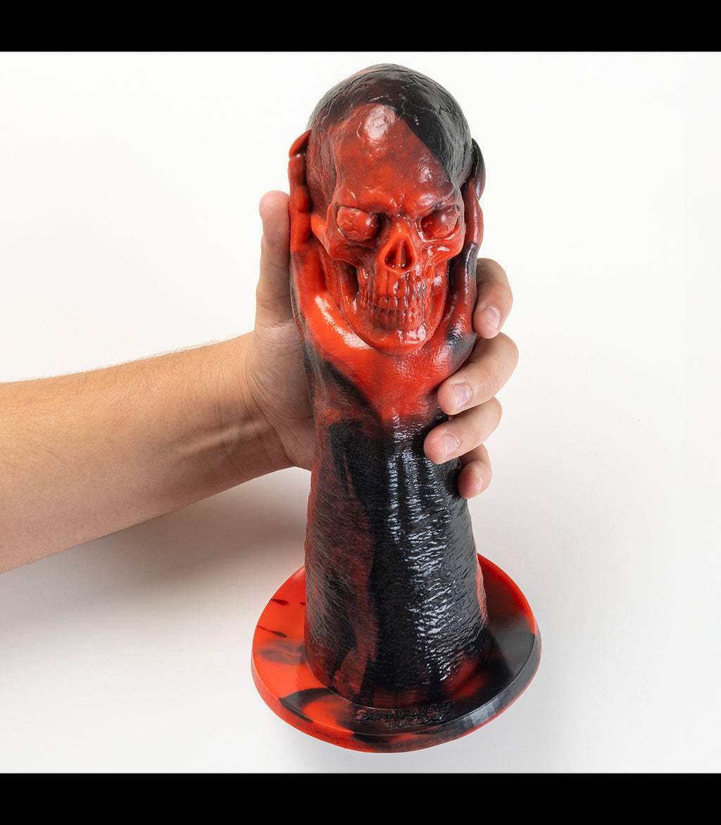 Enjoy, feel, play.... Discover your wild side with the Virgit Strange & Wild Things collection. Made of platinum silicone, it is characterized by a soft and silky feel that will allow for better insertion. This dildo has a rounded shape at the end, simulating a skull held by an arm. Water-based lubricant is recommended for a more pleasurable experience. Available with suction cup base (SWT NINE VACCUM ADAPTER) Measurements: 31 cm high x 14.15 cm in diameter. Insertable measurements: 28 cm x 7.5 cm. Weight: 1.65 kg.
